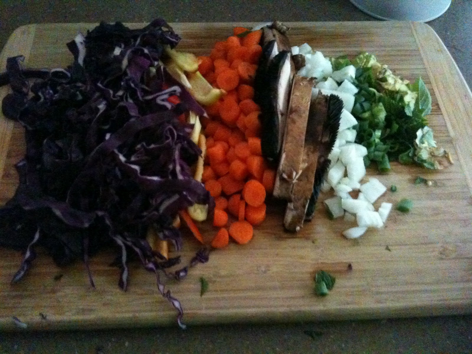 Combine the coconut milk, coconut cream, and 2 cups of the broth in a large pot over medium heat. Stir in the curry paste, ginger, garlic, red pepper flakes and onion. Bring to a boil. Add the rest of the vegetables bring to a boil again. Add the rice noodles and incorporate them into the soup add the rest of the broth. Reduce to a simmer and let cook for 25 to 30 minutes. Feel free to add Sriracha sauce if you need more heat!